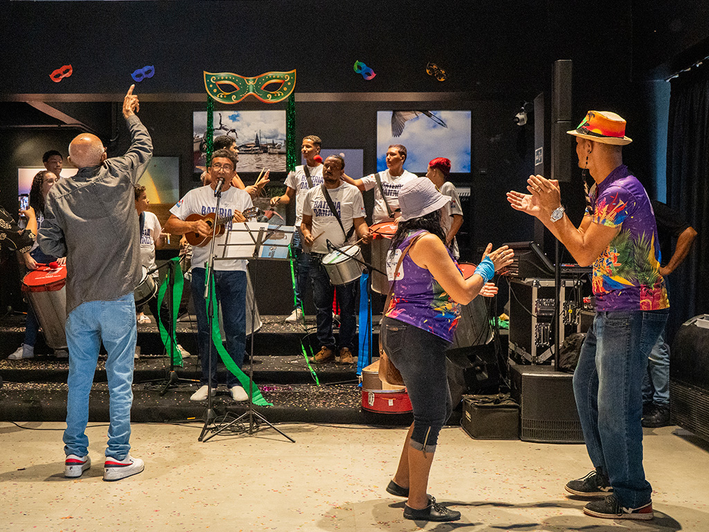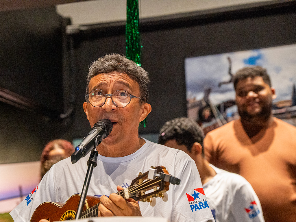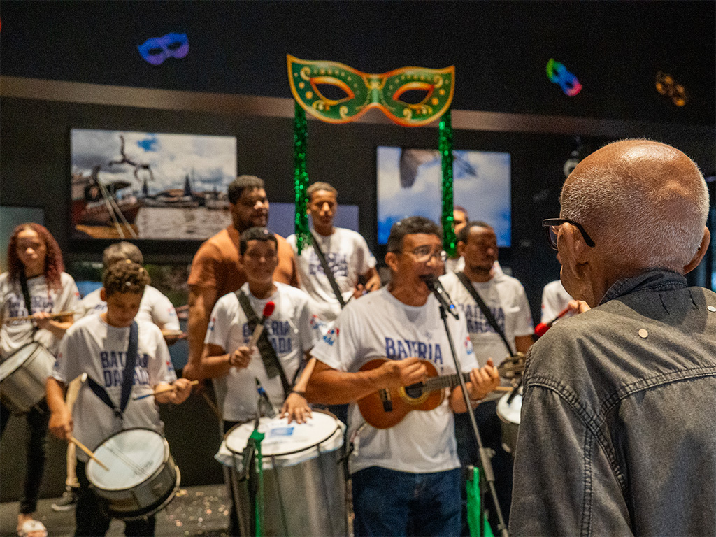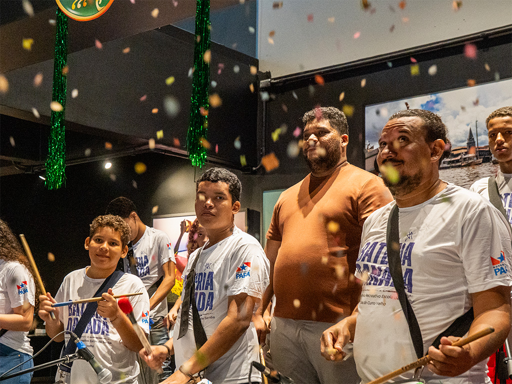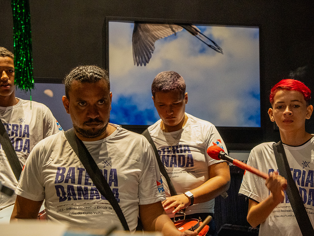 O evento, que aconteceu das 10h30 às 11h30, transformou o Centro Cultural Banco da Amazônia em um verdadeiro reduto do samba paraense. A Bateria Show do Grêmio Recreativo Escola de Samba Crias do Curro Velho conduziu o público em um cortejo de percussão que misturou tradição, juventude e um repertório vibrante.