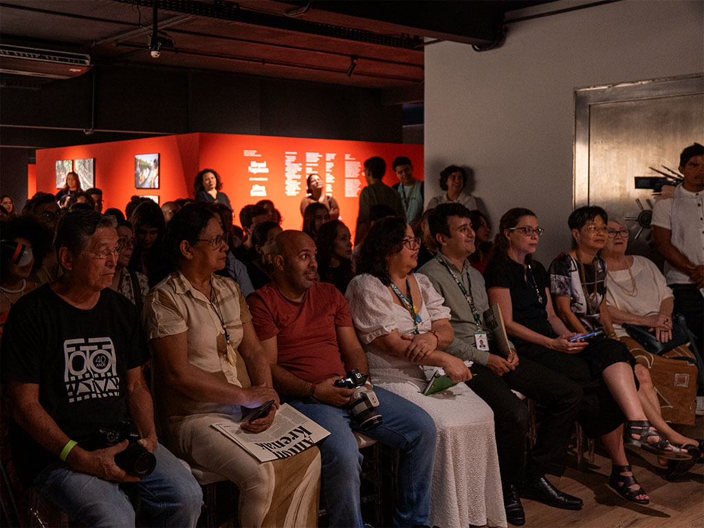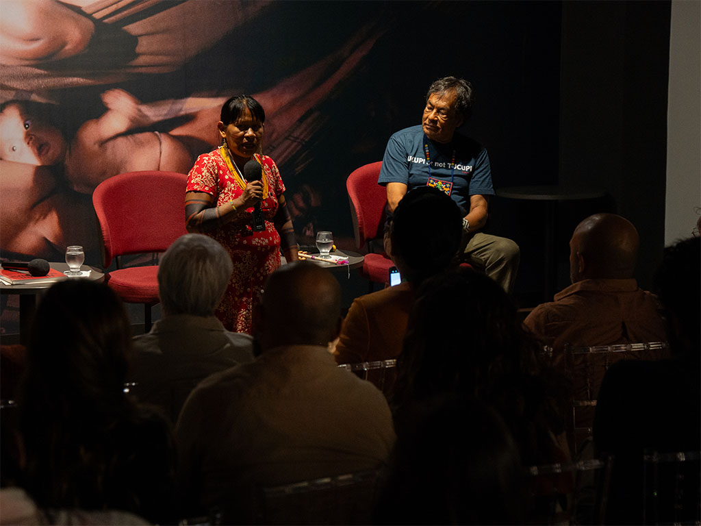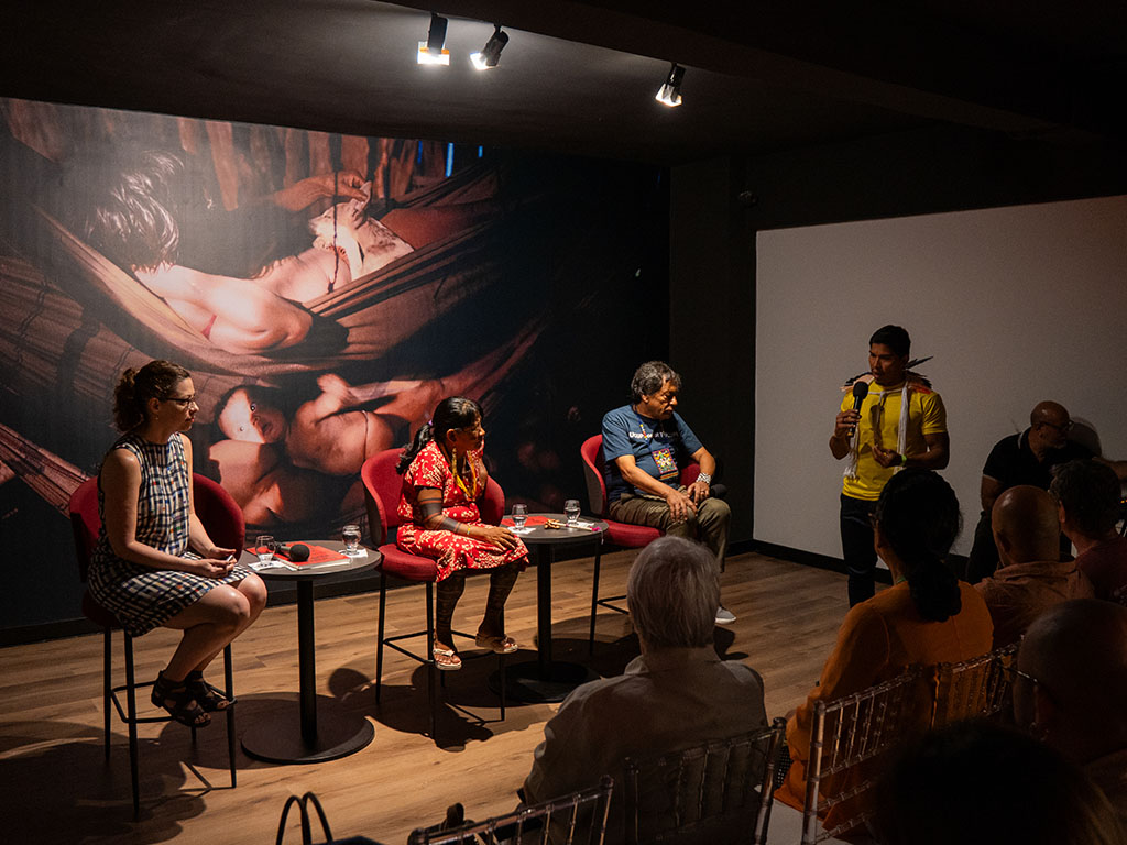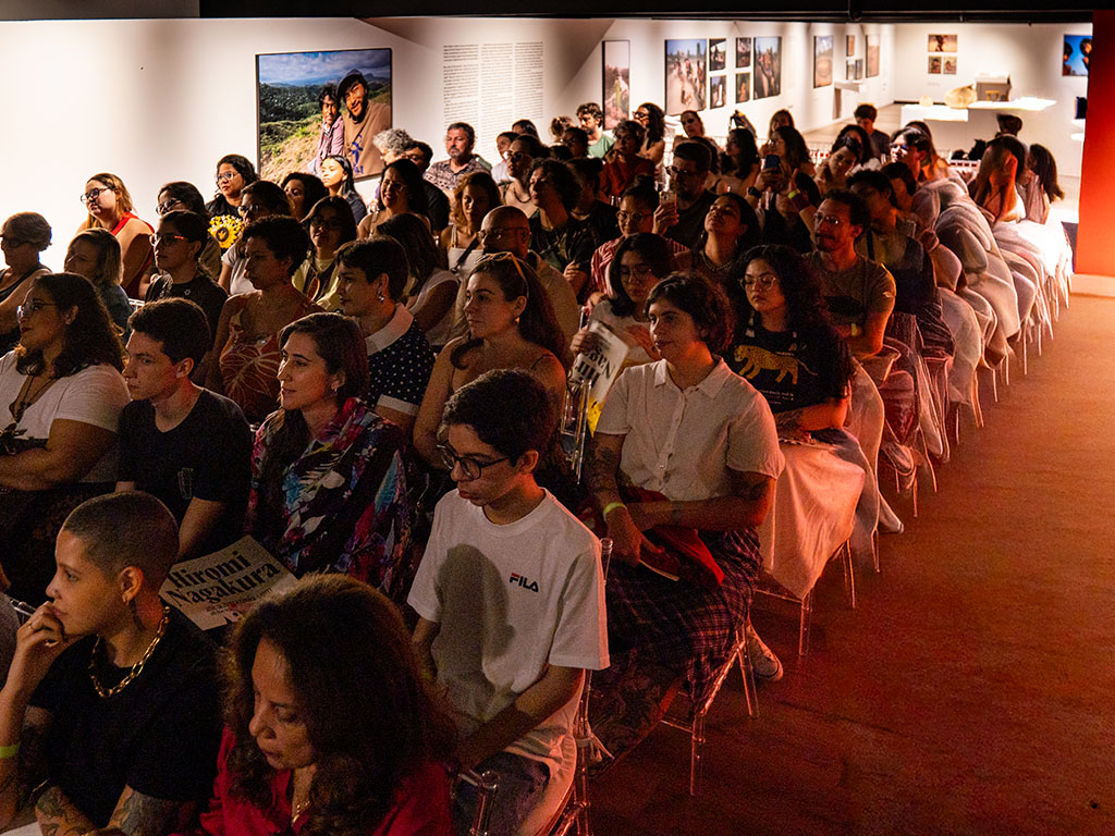 À noite do mesmo dia, a Galeria 1 voltou a reunir o público para a mesa de debate “O encontro de Ailton Krenak e Hiromi Nagakura com os povos da floresta e do cerrado”. A conversa reuniu lideranças indígenas que integram as comunidades fotografadas na exposição: Isa Tximá Huni Kuin, Maria Alexandrina da Silva Pinhanta (Sãtsi), Maria Salete Caapir Krikati e Marineusa Pryj Krikati .
