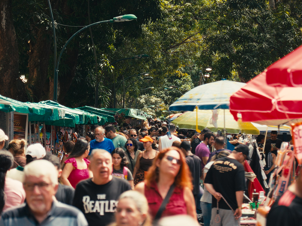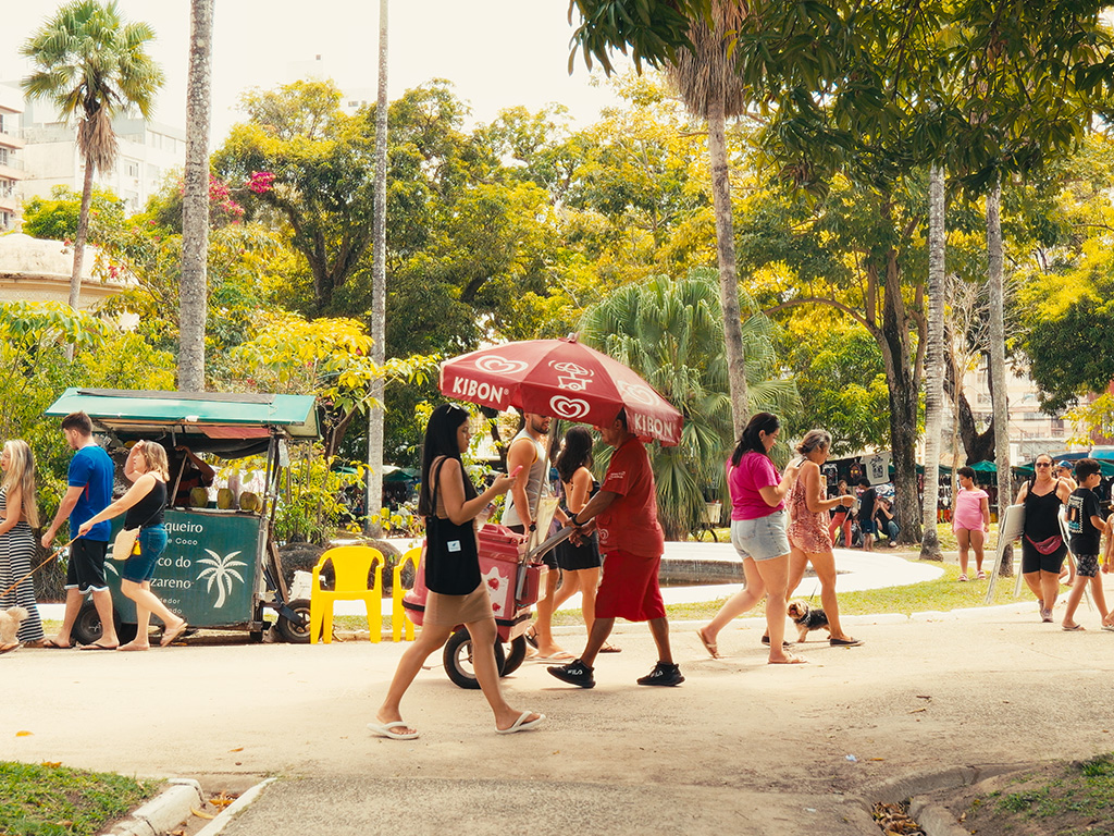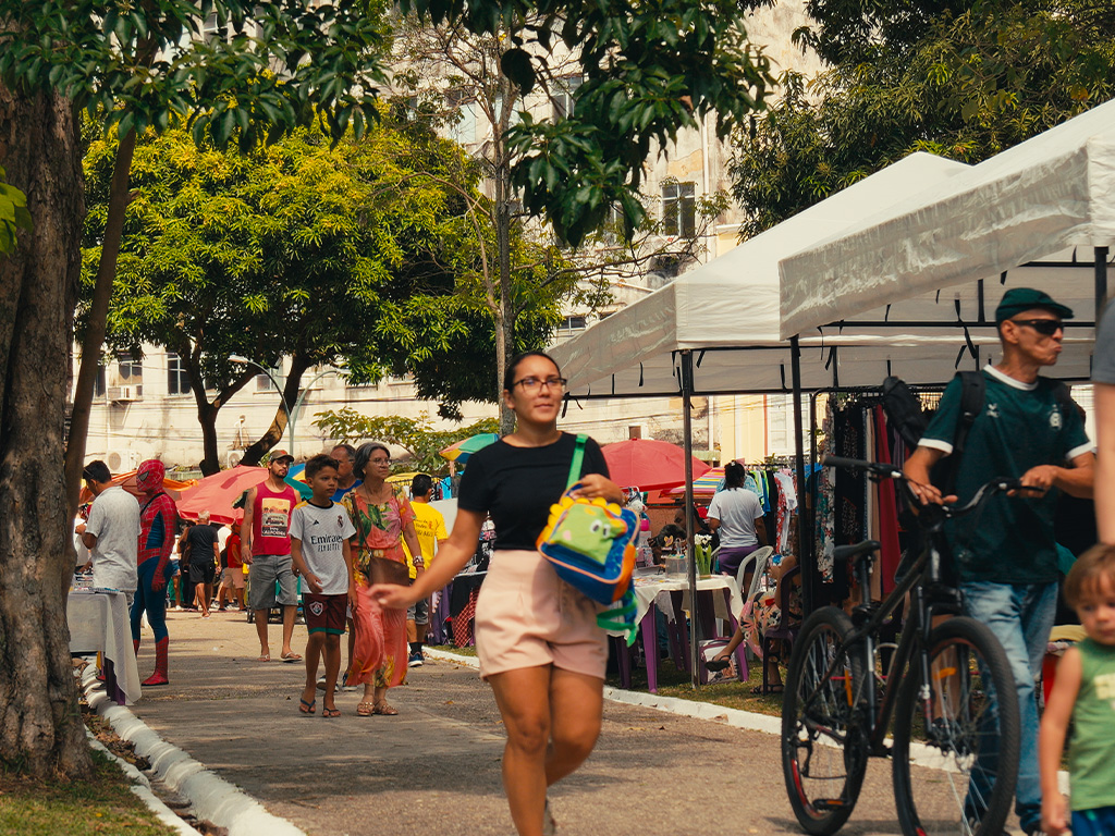 A Praça da República vibra com a cultura e gastronomia de Belém. As barraquinhas de comidas típicas cativam pelo olfato e paladar, enquanto o artesanato chama a atenção pelas cores, texturas e talento local.