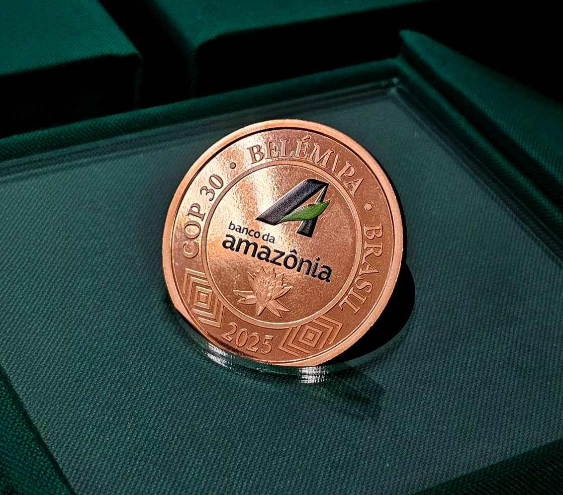 Para celebrar a COP 30 em Belém, o Banco da Amazônia lança a medalha comemorativa especial do evento, cunhada pela Casa da Moeda do Brasil.