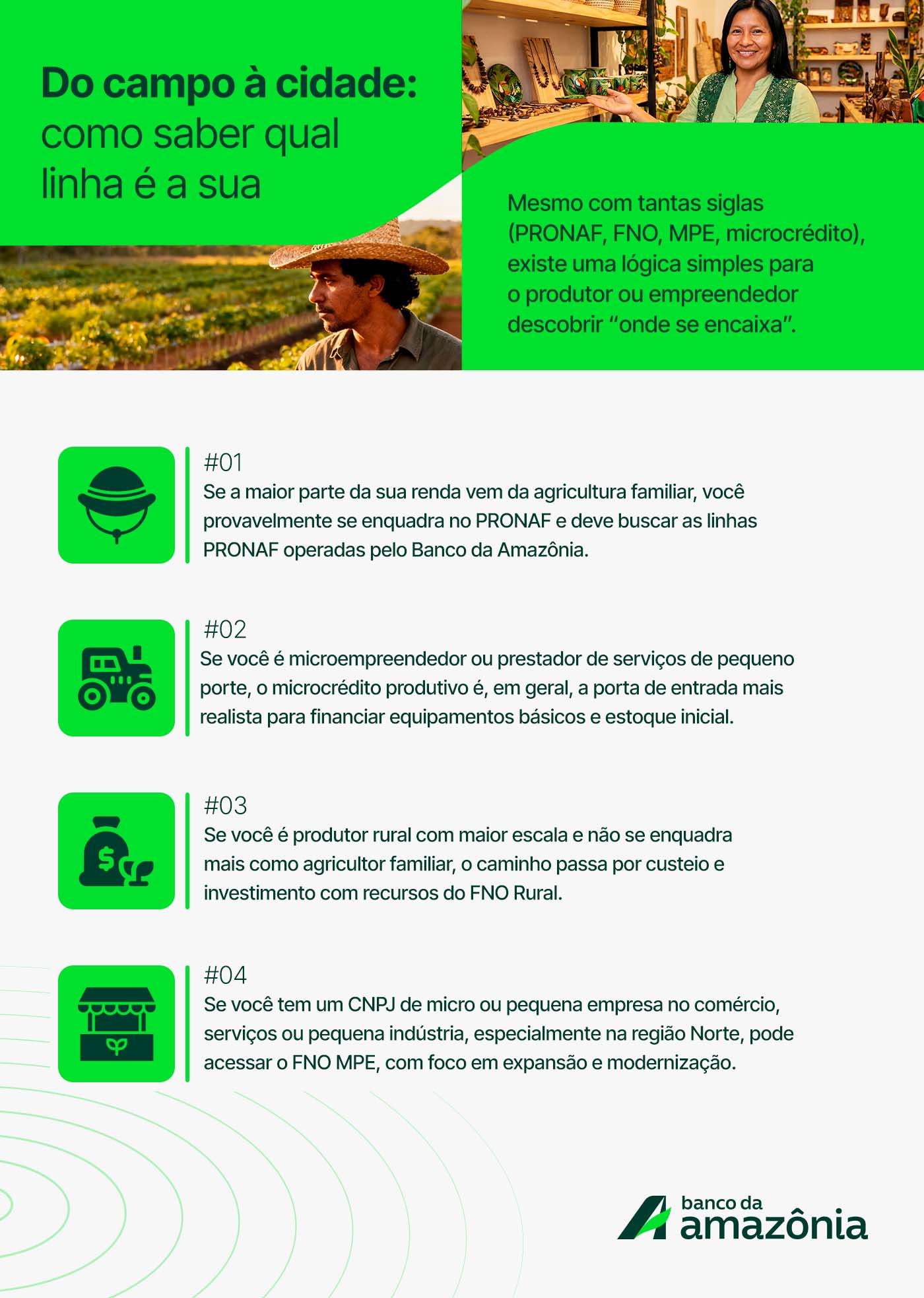 No campo, a porta de entrada principal para pequenos produtores é o PRONAF (Programa Nacional de Fortalecimento da Agricultura Familiar), operado pelo Banco da Amazônia na região Norte. Ele é voltado para famílias que tiram a maior parte da renda da atividade rural, têm mão de obra predominantemente familiar e se enquadram em critérios de renda e produção definidos pelo governo federal.