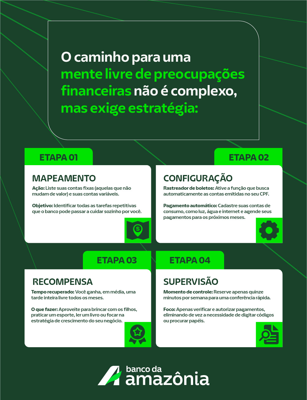 Além da organização visual, é fundamental colocar as contas de consumo no piloto automático para garantir que a manutenção da rotina não dependa exclusivamente da memória humana.