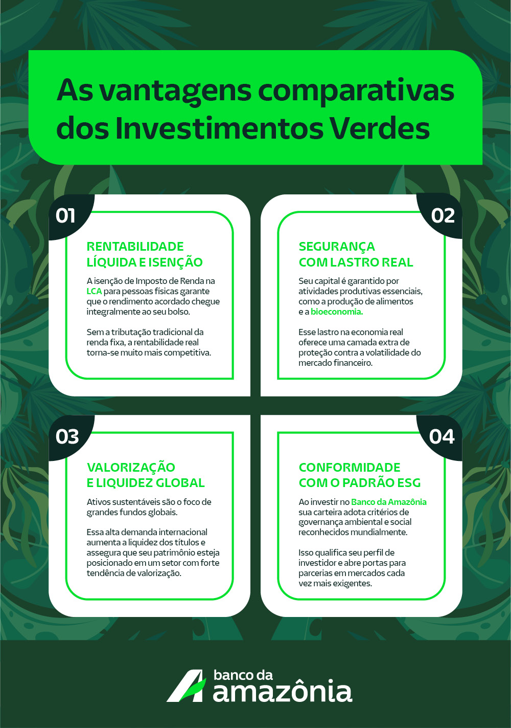 A solidez do Banco da Amazônia aliada à rentabilidade dos ativos sustentáveis oferece o equilíbrio ideal para quem não quer abrir mão da segurança enquanto vê o patrimônio florescer.