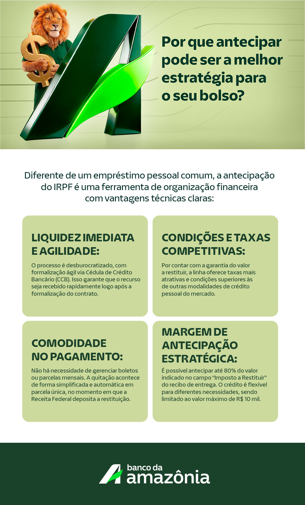 Público-alvo: A linha é voltada para clientes Pessoa Física que indicarem o Banco da Amazônia como a instituição para recebimento da restituição em sua declaração.