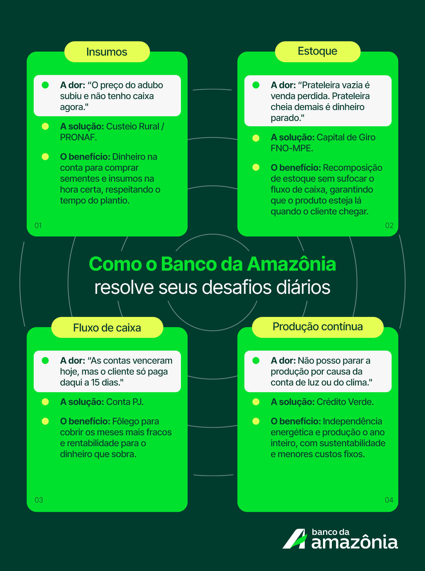 O Banco da Amazônia entende essa realidade diversa e oferece crédito sob medida: capital de giro, custeio e apoio financeiro como parceiro estratégico para resolver desafios operacionais e sustentar o crescimento.