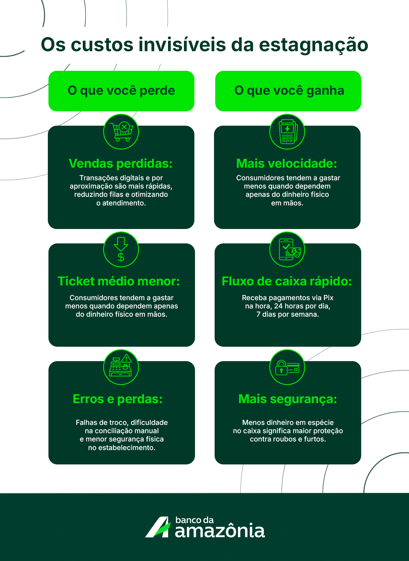 Manter o foco em transações físicas gera custos invisíveis. O manuseio de grandes volumes de dinheiro exige tempo para contagem, aumenta a margem de erro humano no fechamento do caixa e gera a necessidade constante de busca por troco.