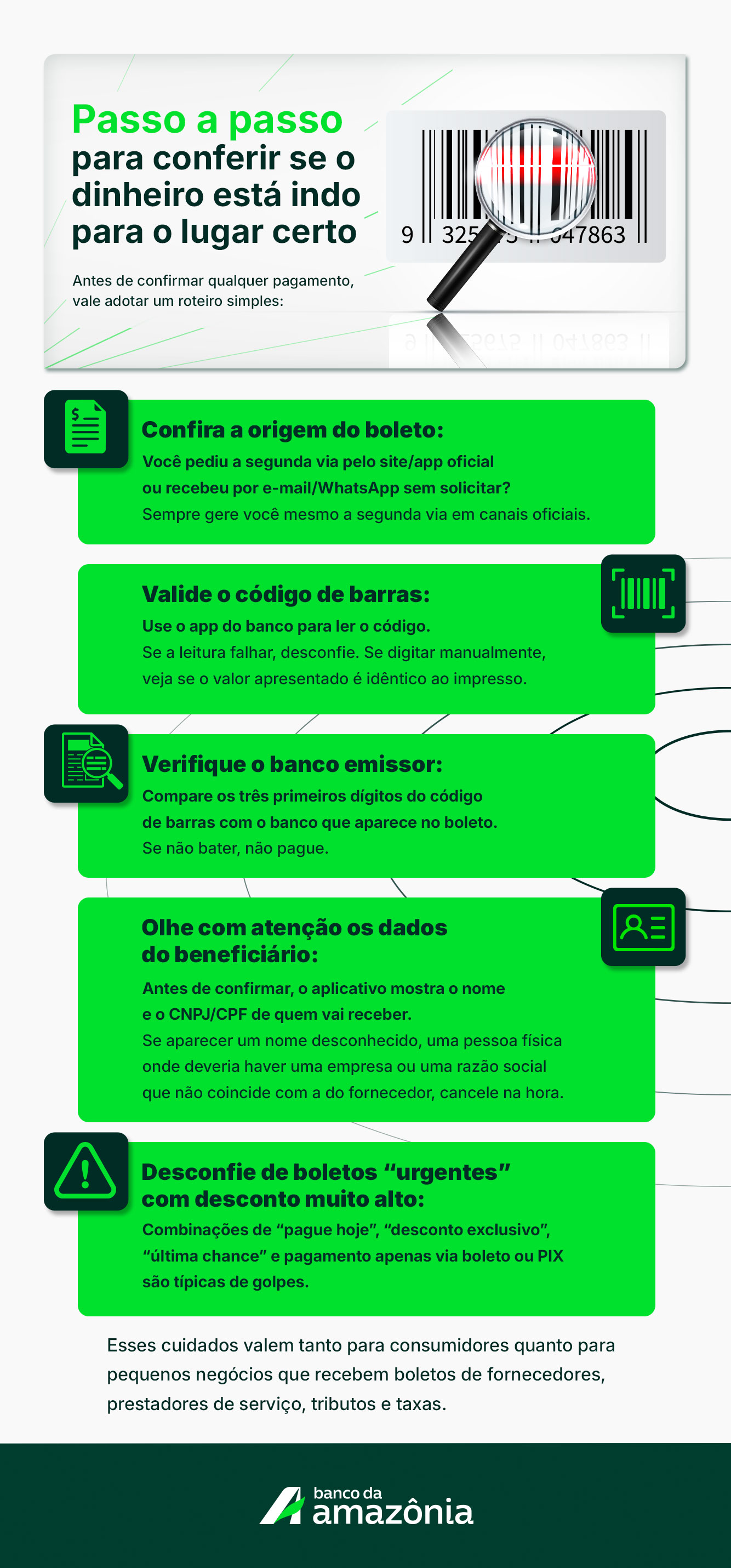 O problema é que, na correria, muita gente aponta a câmera do celular, vê o valor certo e confirma o pagamento sem olhar para quem está recebendo. Ao usar o app do Banco da Amazônia ou o internet banking, sempre confira com calma os dados que aparecem antes de concluir.