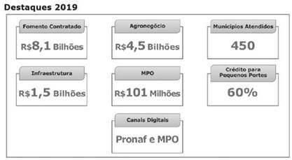 De acordo com o documento divulgado, a atuação do Banco atingiu os 450 municípios da Amazônia Legal e tiveram como maior foco os negócios de pequenos portes – agricultores familiares, mini, pequenos e pequeno-médios produtores rurais e suas cooperativas e associações, microempreendedores individuais, microempresas e empresas de pequeno e pequeno-médio porte – com ênfase para a valorização da pequena produção de base familiar. Os pequenos foram alvo de 60% do crédito oferecido em 2019 com contribuição direta dos aplicativos Pronaf e MPO Digitais que contribuíram para este resultado. O agronegócio regional recebeu R$ 4,5 bilhões, o Microcrédito Produtivo Orientado (MPO) teve o total de R$ 101 milhões investidos e o setor de infraestrutura foi alvo de R$ 1,5 bilhões em contratações.