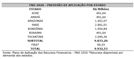 Para o ano de 2020, estão disponíveis para investimentos na região R$13 bilhões dos quais, R$ 9,9 bilhões são oriundos do FNO, distribuídos nos estados conforme abaixo: